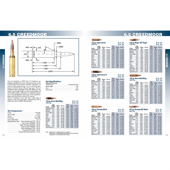 Kirja tarjoaa kaikki paineet ja nopeudet, ja se on painettu täysivärisesti. Lisäksi se sisältää artikkeleita huippu-PRS-kilpailijoilta. Lyman Long Range Reloading Manual sisältää pitkän matkan dataa suosituista kaliibereista, kuten: