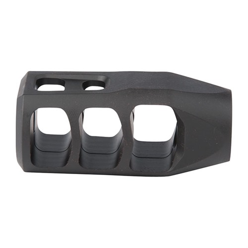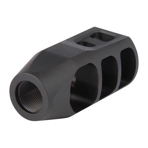 SPECS: HTSR 416 stainless steel, HRC 28-32, DLC finish - matte black. 5.56 version is 1.125" wide, .990" high, 2.225" long (.750" dia. at barrel), 3.3 oz. weight. Fits .223/5.56mm caliber rifles with 1/2-28 threads.