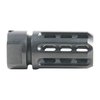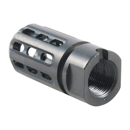 Features: Compensator specifically designed for the 14x1LH Metric Threads found on most AK47 rifles Machined from 8620 steel with a black oxide finish Heat treated for a life of hard use A total of eighteen ports distributed around the upper 270 degrees of the device help stabilize and reduce exiting gas pressure There are no ports facing directly upwards Lower 90 degree arc also has no gas ports Can safely be used with projectiles up to .311 inches (7.62mm) in diameter Outer diameter is a NATO standard 22mm Made in USA, counting towards 922r complianceBenefits: Designed to provide recoil reduction and virtually eliminate muzzle rise No ports facing upwards allows for an uninterrupted sight picture when firing Lower degree arc with no ports reduces the dust signature when fired in the prone position Can be used on rifles of varying caliber, up to 7.62 mm