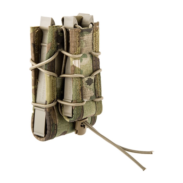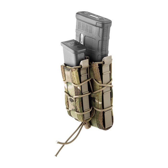 High Speed Gear’s Double Decker TACO® magazine carrier combines their modular rifle mag pouch and a modular pistol mag pouch into one secure unit. This unique pouch can securely hold a variety of combinations of mags and other accessories. The original TACO® forms the base and USGI, HK, PMAG, ARC, FAL, AK 30/ 40, LR20 and M14 magazines are all held securely and deployed easily and silently on demand. The HSGI TACO® even works for certain radios, flash bangs and smoke grenades providing versatility while taking up only 3” horizontal inches on your platform. On top, they attached a Pistol TACO®. This versatile pouch will hold almost any pistol magazine. Single stack, double stack; it makes no difference. 1911, HK 45, M9/Beretta 92, Glock, XD mags are all held securely and deployed easily and silently on demand. The HSGI Pistol Taco® can also hold a variety of multi-tools and flashlights. Both Taco pouches are made of Cordura, an injection molded polymer and shock-cord. The pouches both maintain a positive, adjustable grip of the mag and do not require any other securing systems unless desired. Webbing tabs are sewn in on the top for use of "over the top" bungee retainers (not included). Additional loop Velcro® is sewn in the inside of the rifle pouch if the user wishes to utilize adhesive backed hook Velcro on their magazine body for added security.