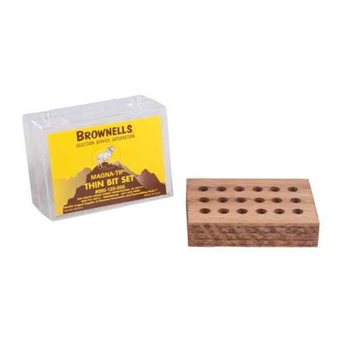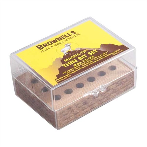 MAGNA-TIP THIN-BIT SET Eighteen incredibly thin bits to fit the extra-narrow screw slots often encountered in the gun shop. Take great care when using these bits. The blade MUST fill the slot from side-to-side and edge-to-edge or it will most certainly break on a firmly seated screw. Freeze spray, heat, penetrating oil, a few taps, regrinding the bit for an even better fit - all these tricks can help give success. Bits Inluded in Kit #120-1 #120-2 #150-1 #150-2 #180-1 #180-2 #210-1 #210-2 #240-1 #240-2 #270-1 #270-2 #300-1 #300-2 #340-1 #340-2 #360-1 #360-2 SPECIFICATIONS: 18 Hardened Steel MAGNA-TIP Bits Hollow Ground Straight Edged Thin Bits Solid Oak Bench Block Clear Plastic Case