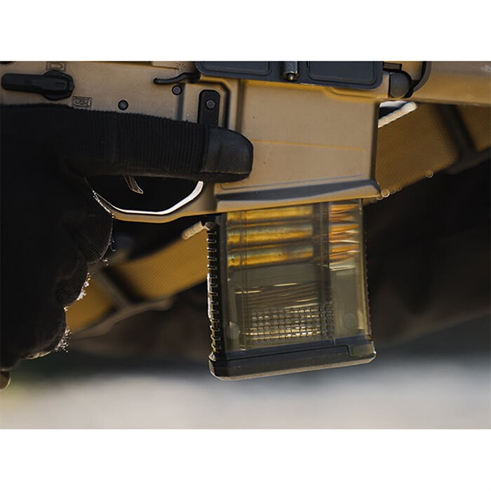 MAGPUL® TMAG® GEN M3 RIFLE MAGAZINE FOR AR-15/M4 on erittäin luotettava, läpinäkyvä patruunalaatikko STANAG-yhteensopiville aseille, jotka käyttävät 5.56x45 NATO/.223 Remington -patruunoita. Muovattu läpinäkyvästä materiaalista, jossa on ODG/Savuharmaa sävy, se tarjoaa ampujille näkyvyyden erilaisten patruunatyyppien sekä laukaisumäärän tarkistamiseksi.