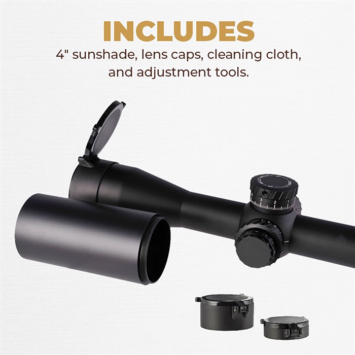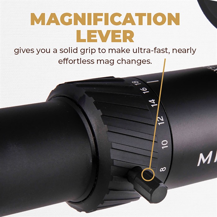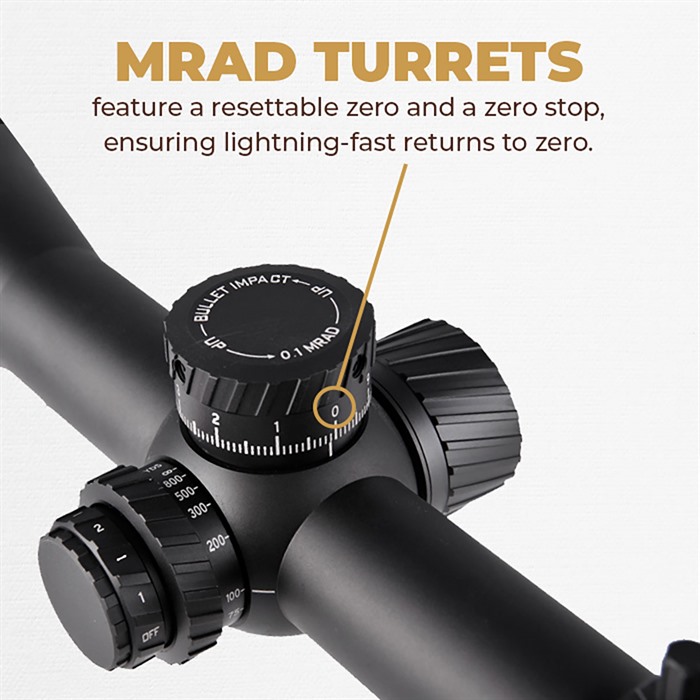 - Retikuli ja tornit: MRAD -nopeita ja helppoja säätöjä varten.