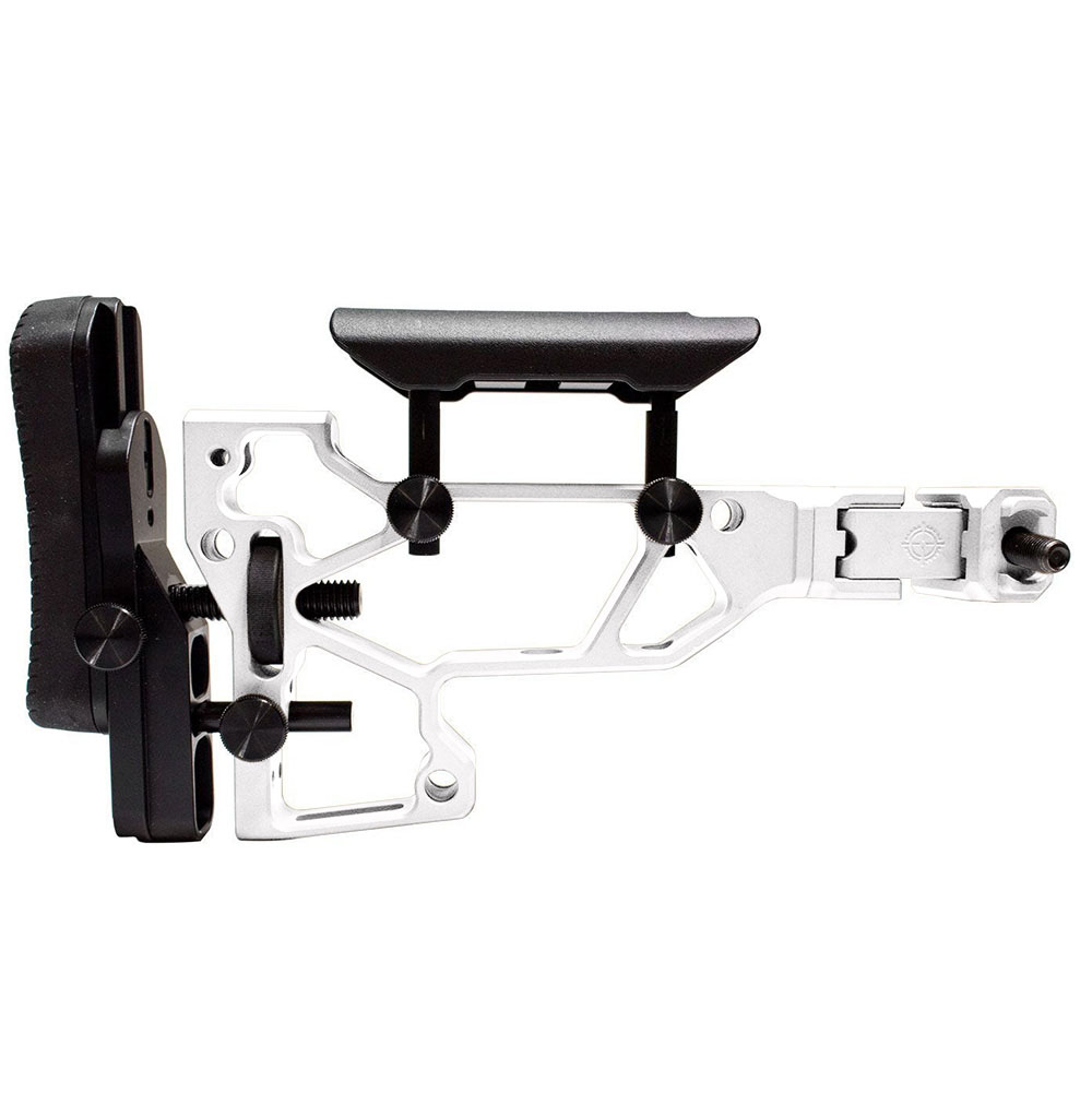 MDT:n Skeleton Rifle Stockin työkaluvapaa säätö parantaa ampujan mukavuutta ja suorituskykyä. Vaakasuora, pystysuora ja kallistus säätö poskipatjalle ja perälevylle varmistaa täydellisen istuvuuden ampumisasentoon.