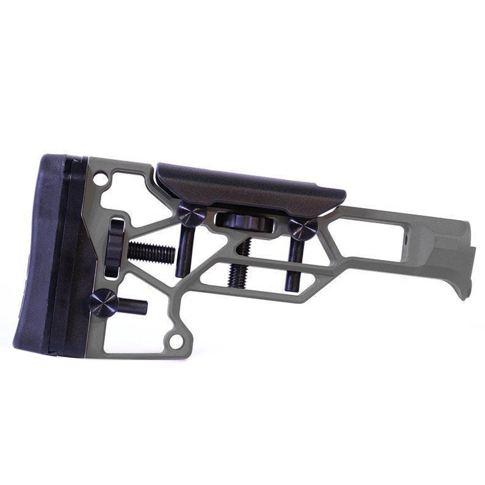 682131931370 Työkaluvapaa säätö MDT Skeleton Rifle Stock -kiväärin peräosassa parantaa ampujan mukavuutta ja suorituskykyä. Vaakasuora, pystysuora ja kallistussäätö poskipakan ja perälevyn osalta varmistaa täydellisen istuvuuden ampumisasentoon. Yhteensopiva TAC21-, LSS-XL- ja HS3-korikustannusten kanssa (AR-15 kivääri / kiinteä liitäntä).