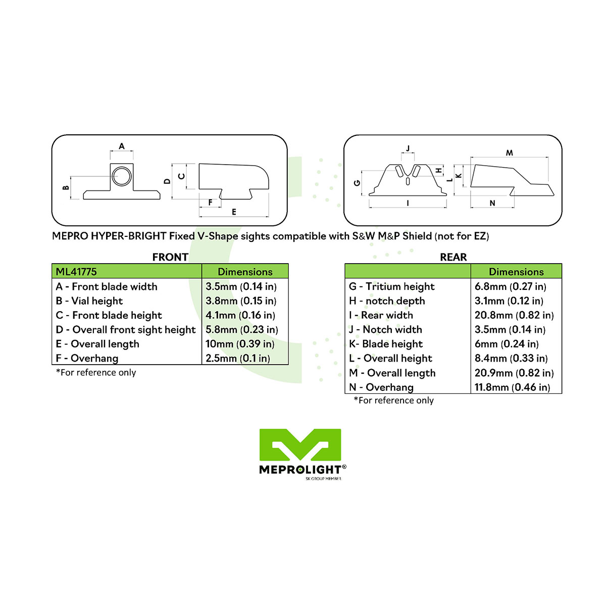 MEPRO HYPER-BRIGHT V-SIGHT FIXED SETS, MEPRO HYPER-BRIGHT V-SIGHT S&W M&P SHIELD (NON-EZ MODELS) - O RING on maailman kirkkaimpia käsikranaattitähtäimiä kaikissa valaistusolosuhteissa. Tritium, joka on erityisesti muotoiltu tarjoamaan teollisuuden ensimmäistä loistetta kirkkaasta päivänvalosta keskiyöhön.