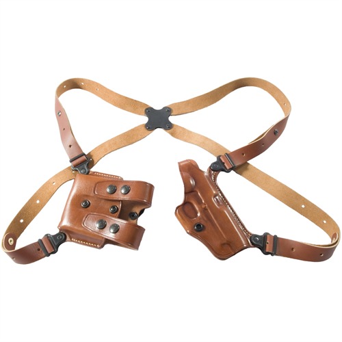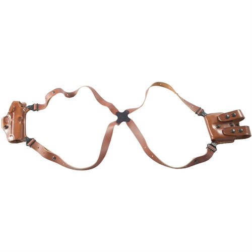 A key component of this shoulder system is its spider harness. All four points of the spider harness pivot independently and are connected by our unique clover shaped Flexalon™ swivel back plate, which is a Galco trademark. This results in a perfect fit and lasting comfort for all sizes and shapes. This system is constructed of premium saddle leather and includes holster, harness, ammo carrier and a set of system screws. The Miami Classic is fully modular. Harness fits chests to 52". Note: Holster system pictured with magazine carrier for semi-auto. Revolver systems include double drop pouch for loose cartridges.
