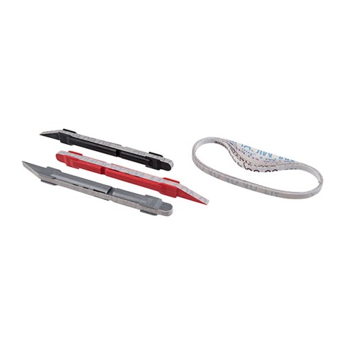3M Micro-Finishing Film on nopea leikkuuaine tarkkaan, tasalaatuiseen, tiukkaan viimeistelyyn. Korkean lujuuden polyesterifilmi ja mikron-asteikolla luokiteltu alumiinioksidi-mineraalihartsiseos on liitetty kestävyyden takaamiseksi. Tämä materiaali on ihanteellinen asehuoltoon, korujen valmistukseen, kellojen korjaukseen sekä lääketieteellisiin laitteisiin. Tämä materiaali toimii hyvin sekä metallilla että muovilla. Jokainen sarja sisältää 3 Hionta-työkalua yhdessä 15 Micro-Finishing Film -vyön kanssa; 5 vyötä kolmessa eri karkeudessa. Hionta-työkalu on täydellinen vaikeasti saavutettavien alueiden viimeistelyyn. Hiontavyö voidaan indeksoida. Hionta-työkalu on jousikuormitteinen, mikä luo jännityksen hiontavyölle. Kun hiontavyö on käytetty, purista työkalua ja vaihda hiontavyö uuteen. Ne on värikoodattu karkeuden helpoksi tunnistamiseksi. Musta: 60 Mikron, 220 Karkeus Harmaa: 50 Mikron, 270 Karkeus Punainen: 40 Mikron, 320 Karkeus Vihreä: 30 Mikron, 400 Karkeus Keltainen: 15 Mikron, 600 Karkeus Sininen: 9 Mikron, 1200 KarkeusPoistettu ohjelmasta