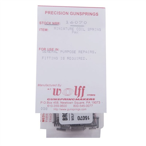 WOLFF MINIATURE COIL SPRING PAK - KIT #1607 sisältää 50 pienikokoista jousijousta, jotka ovat täydellisiä ampuma-aseiden tarpeisiin. Tämä paketti kattaa jouset, joiden ulkohalkaisijat vaihtelevat 1⁄16" (1.7mm) ja 5⁄32" (4mm) välillä, tarjoten sekä englanninkielisiä että metrisia vaihtoehtoja.