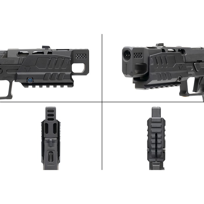 Tuote on valmistettu S45C-teräksestä, ja siinä on Quench Polish Quench (QPQ) -prosessin viimeistely. Strike Modular Chassis (SMC) Comp auttaa nopeasti ja yksinkertaisesti vähentämään tuntuvia rekyylejä ja vaimentamaan piipun nousemista.