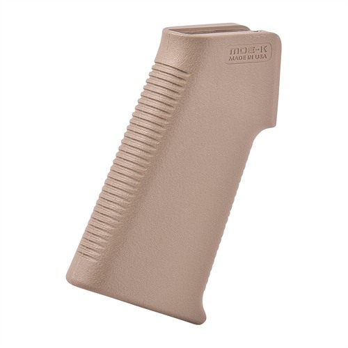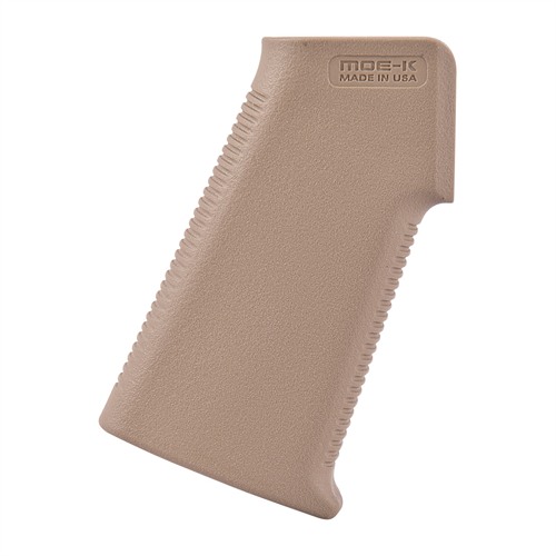 Designed as a drop-in upgrade for the standard AR15/M4 pistol grip, the MOE-K Grip provides an extremely low profile and compact design with a steeper grip angle compared to more traditional styles. The more vertical grip angle is optimized for use on PDW (Personal Defense Weapon) configurations and improves comfort and control on short LOP rifles that bring the primary hand in closer to the shooter's body. The thin profile and lack of backstrap 'beavertail' also makes it an excellent choice for shooters who prefer a smaller grip circumference. FEATURES All mounting hardware is included. One-piece reinforced polymer construction More vertical grip angle than standard A2 grips Minimalist design provides a compact and narrow profile Aggressive TSP texture for positive weapon control Made in the USA SPECS Platform: AR10, AR15, M4, M16, M110, SR25 Grip Angle: 20 degrees Height, receiver to bottom: 3.8 in. Thickness, max: 1.0 in. Weight, w/ hardware: 2.4 oz. NOTE: Will also fit most 7.62 NATO AR10/SR25 style of rifle