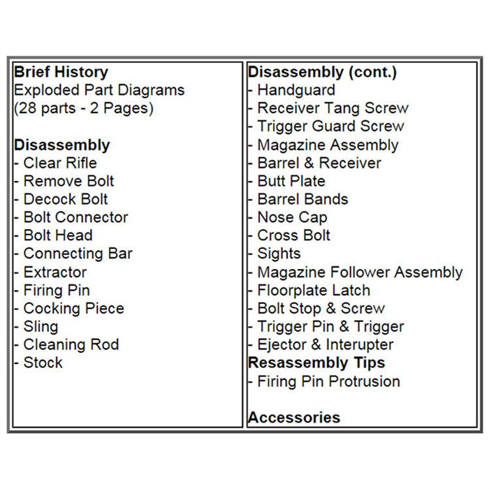 Jokainen Mosin-Nagant Rifles Assembly and Disassembly Guide -opas sisältää yksityiskohtaiset kaaviot ja kuvitukset, jotta lukijat voivat tutustua kiväärin suunnittelun ja rakenteen jokaiseen elementtiin. Kuvia on rikastettu monivaiheisilla kokoamisohjeilla, jotka ovat helppoja seurata.