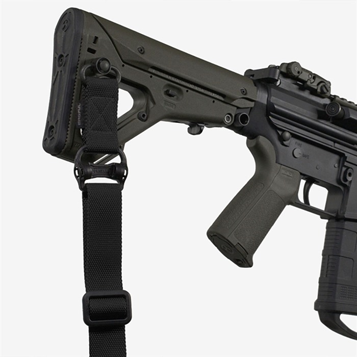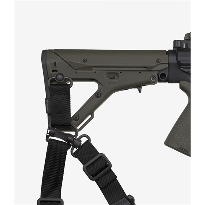 Combine with the MS1® Sling and QD Sling Swivel to provide two to one-point convertibility. Constructed of QPQ salt bath nitride and manganese phosphate finished steel with custom, snag-free, high durability 1-1/4" webbing. Made in the USA. NSN: MAG519-COY 1005-01-665-9430 DURABLE CONSTRUCTION Custom 1.25 inch wide nylon webbing material is strong and wear resistant Colored webbing has Near Infrared (NIR) treatment to reduce IR signature QPQ salt bath nitride and phosphate finished steel for corrosion resistance SIMPLE, STRONG, SECURE Combine with the MS1 Sling and additional QD Sling Swivel to provide fast transition between one-point and two-point configuration Heavy-duty push-button QD Sling Swivel for one-point attachment QD Sling Swivels and ambidextrous QD shackle allows easy convertability and provides weapon quick-release capabilities in an emergency Attachment: QD Cups & Sockets SLING ASSEMBLY MOUNTING REAR - Works with receivers, end plates, and buttstocks that have a push-button QD socket for one-point attachment. FRONT - Using optional QD Sling Swivel, compatible with the Magpul RSA®-QD and Forward Sling Mounts, as well as most other push-button QD sockets for use in two-point mode.