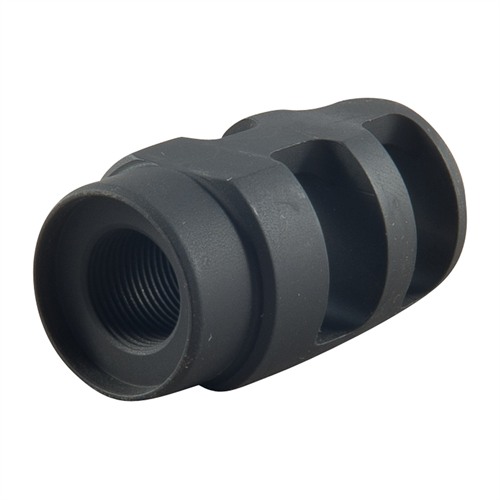 SPECS: 4140 steel, matte black. 1¾” (4.4cm) long. 1” (2.5cm) O.D. Crush washer included. 5.56/.223 – 2.8 oz. (79.3g) wt. Fits barrels with ½”-28 tpi threads.