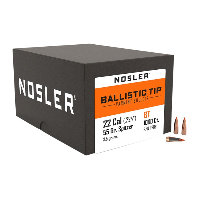 NOSLER BALLISTIC TIP HUNTING 22 CAL (0.224") BOAT TAIL RIFLE BULLETS Thriving on ultra-high velocity loads, the Ballistic Tip® Varmint bullet offers devastating performance at distances both near and far. The aerodynamic polymer tip (color coded by caliber) combined with the ultra-thin jacket mouth assures rapid and violent expansion at either end of the velocity scale. The bullet is equipped with a gradually thickening jacket wall that provides maximum energy transfer and optimum weight retention while the ballistically-engineered Solid Base® acts as a platform for large diameter mushrooms. No matter the rifle/cartridge combination you’re shooting or what varmint you’re shooting at, Nosler Ballistic Tip® delivers match-grade accuracy with all the performance characteristics serious varmint hunters are looking for. FEATURES: Polymer Tip Streamlined tip color coded by caliber. Ultra-Thin Jacket Mouth Assures violent expansion at either end of the velocity scale. Uniform Gradual Thickening The uniform, gradual thickening is designed to keep the bullet together until impact at any velocity. Ballistically Engineered Solid Base Boat tail configuration combines with the streamlined polymer tip for extreme long-range performance and easier loading.