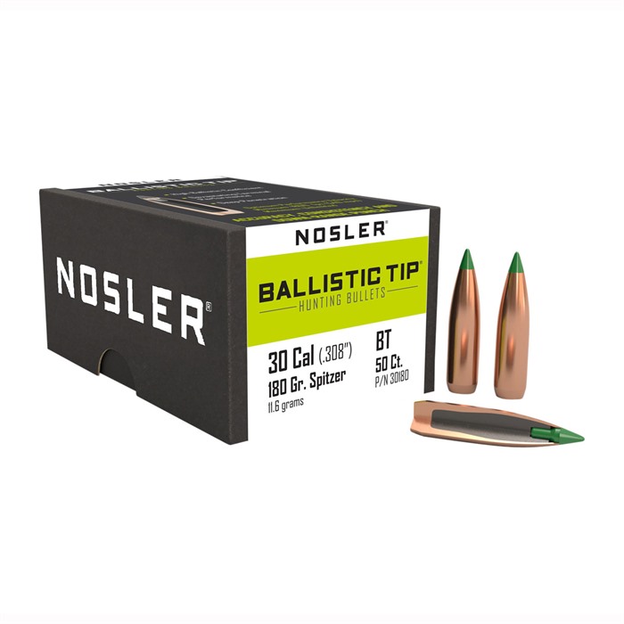 NOSLER BALLISTIC TIP HUNTING 30 CALIBER (0.308") BOAT TAIL RIFLE BULLETS Thriving on ultra-high velocity loads, the Ballistic Tip® Varmint bullet offers devastating performance at distances both near and far. The aerodynamic polymer tip (color coded by caliber) combined with the ultra-thin jacket mouth assures rapid and violent expansion at either end of the velocity scale. The bullet is equipped with a gradually thickening jacket wall that provides maximum energy transfer and optimum weight retention while the ballistically-engineered Solid Base® acts as a platform for large diameter mushrooms. No matter the rifle/cartridge combination you’re shooting or what varmint you’re shooting at, Nosler Ballistic Tip® delivers match-grade accuracy with all the performance characteristics serious varmint hunters are looking for. FEATURES: Polymer Tip Streamlined tip color coded by caliber. Ultra-Thin Jacket Mouth Assures violent expansion at either end of the velocity scale. Uniform Gradual Thickening The uniform, gradual thickening is designed to keep the bullet together until impact at any velocity. Ballistically Engineered Solid Base Boat tail configuration combines with the streamlined polymer tip for extreme long-range performance and easier loading.