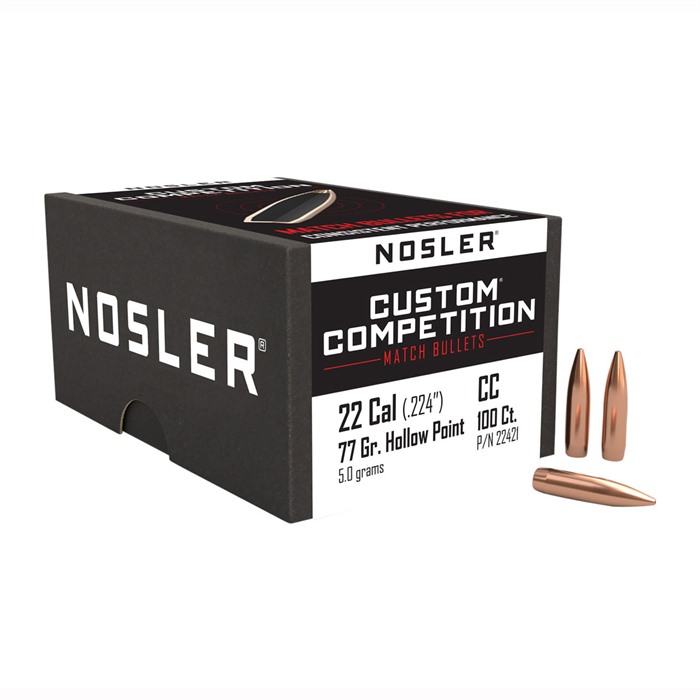 CUSTOM COMPETITION 22 CALIBER (0.224") HOLLOW POINT BOAT TAIL RIFLE BULLETS Blending the accuracy of Nosler Custom Competition bullet jackets with our own ultra-precise, lead-alloy cores, we’ve created one of the most accurate match rifle bullets on the market. The hollow point provides a small meplat for reduced drag and increased aerodynamic efficiency while the pronounced boat-tail design provides exceptional flight characteristics over a wide range of velocities. Engineered to exhibit unmatched accuracy, the custom quality jacket form-fits the lead-alloy core for maximum bullet stability and balance. Hand-inspected for quality assurance, Nosler Custom Competition bullets rival all others on the range. FEATURES: Hollow Point Custom Quality Jacket Form-Fitted, Lead-Alloy Core Pronounced Boat-Tail Design