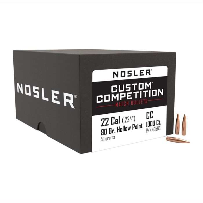 CUSTOM COMPETITION 22 CALIBER (0.224") HOLLOW POINT BOAT TAIL RIFLE BULLETS Blending the accuracy of Nosler Custom Competition bullet jackets with our own ultra-precise, lead-alloy cores, we’ve created one of the most accurate match rifle bullets on the market. The hollow point provides a small meplat for reduced drag and increased aerodynamic efficiency while the pronounced boat-tail design provides exceptional flight characteristics over a wide range of velocities. Engineered to exhibit unmatched accuracy, the custom quality jacket form-fits the lead-alloy core for maximum bullet stability and balance. Hand-inspected for quality assurance, Nosler Custom Competition bullets rival all others on the range. FEATURES: Hollow Point Custom Quality Jacket Form-Fitted, Lead-Alloy Core Pronounced Boat-Tail Design