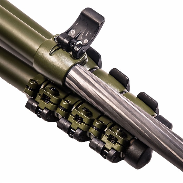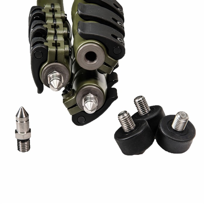 Keskikolonni voi pyöriä täysin 365°. Tämä on loistava ominaisuus niille, jotka aikovat kiinnittää suoraan PIG Saddle- tai HOG Saddle -jalustaan. Jalustan jalat sisältävät vaihdettavat kumiset tai piikkijalat (piikkijalat sisältyvät). PIGlite-CF4 Hiilikuitujalustalla on 24 lbs:n raskaan käytön painoluokitus ja se on viimeistelty tasaisella OD Green -maalilla.
