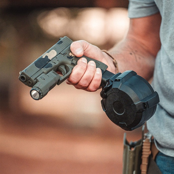 With Magpul's D-50 GL9 magazine, you won't have to complain about sore thumbs from reloading magazines, because most of your range session will fit into this bad boy. This 50-round drum magazine has been optimized for use on Glock handguns, and it's been built with the features from the company' other 9mm drum magazines, ensuring that you get the best possible performance while keeping that trigger finger happy. The Magpul D-50 GL9 includes an increased feed-tower length, which makes it compatible with today's popular Glock models. The unique design of the drum makes the overall size of the unit more manageable, and there's a ratcheting mechanism for loading that saves your fingers when reloading 50 rounds. You can keep an eye on the number of rounds you have remaining, thanks to the rear round-count window and a rolling capacity indicator. The design will also lock your slide back, thanks to the built-in bolt hold-open device. Magpul warns that users of the D-50 GL9 magazine with Gen 1-3 Glocks will likely need a new factory magazine release installed to support the drum's weight. Gen 4 Glocks will need a strengthened aftermarket magazine release, and all models may need a new extra-power recoil spring to ensure reliability. Use of the D-50 GL9 in pistol-caliber carbines is also not recommended, because of the height of the feed tower.