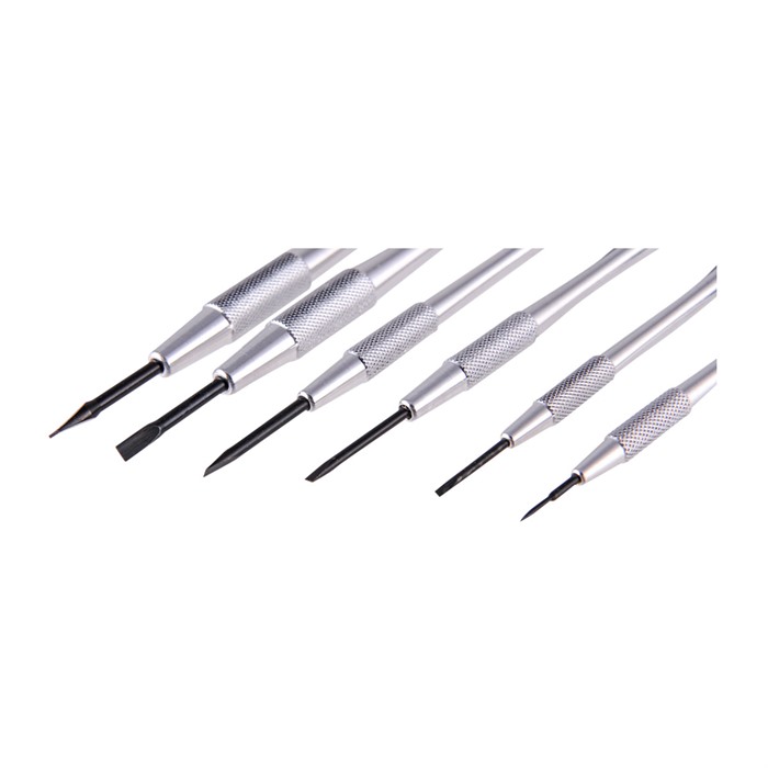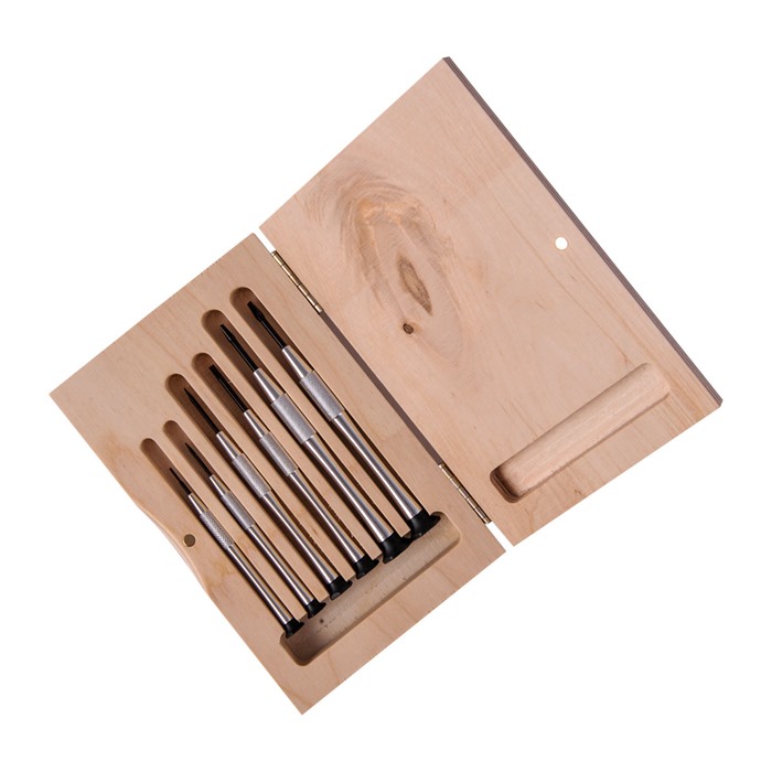 Hinged-puulaatikossa erittäin korkealaatuinen työkalu pienimpien aseiden ruuvien käsittelyyn. Tarkkuusruuvimeisselit. Kahvat ovat alumiinia, uritettu parempaa käsittelyä varten. Terät ovat hiottua, karkaisettua terästä. Pää on vapaasti kääntyvä. Vaihdettavat terät pidetään tiukasti paikallaan erityisten puristimien avulla. Täydelliset ruuvimeisselit myydään joko täydellisenä settiä tai erikseen.Toimitusaika noin 2-4 viikkoa.