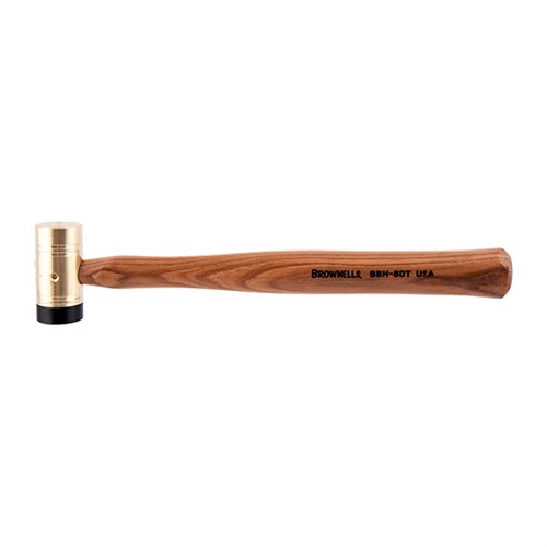PREMIUM DELRIN-TIPPED BRASS HAMMER The Brownells Premium Delrin-Tipped Brass Hammer is a precision-crafted tool designed for gunsmiths, firearm enthusiasts, and professionals seeking reliable performance and exceptional versatility. Made in the USA, this hammer is built to handle both delicate and robust tasks with ease. Key Features: Dual-Function Head: Featuring a solid brass head for delivering firm, effective strikes and a replaceable Delrin tip for softer, non-marring impacts. This dual-purpose design makes it ideal for sensitive firearm components and heavy-duty tasks. High-Quality Materials: The brass head is crafted from durable CDA 360 brass rod and hand-polished for a professional finish, ensuring long-lasting reliability. Ergonomic Hickory Handle: The handle is made from properly seasoned hickory, hand-turned, and securely pinned for a comfortable grip and excellent control during use. Replaceable Delrin Tip: The Delrin tip provides flexibility for tasks requiring precision and surface protection, extending the hammer's functionality. Specifications: 8oz Hammer: Face Dimensions: 1” Length of Head: 2.1” Overall Hammer: 10” 16oz Hammer: Face Dimensions: 1.25” Length of Head: 2.6” Overall Hammer: 10.5” Applications: This hammer is perfect for a range of gunsmithing tasks, including driving pins, aligning components, and performing assembly or disassembly without damaging finishes. Its dual-head design ensures adaptability for both delicate and demanding applications. Customer Feedback: Users frequently praise the Brownells Premium Delrin-Tipped Brass Hammer for its superior craftsmanship and ergonomic design. Many highlight the versatility of the dual-purpose head, which balances strength with the care needed for sensitive surfaces. Summary: The Brownells Premium Delrin-Tipped Brass Hammer is an essential tool for gunsmiths and firearm enthusiasts who value precision and quality. Combining durable materials with thoughtful design, this hammer offers reliable performance for a wide variety of gunsmithing tasks.