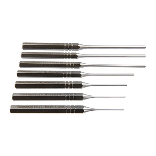 PREMIUM ROLL PIN PUNCHES The Brownells Premium Roll Pin Punches are precision-engineered tools designed to facilitate the removal and installation of roll pins in firearms, ensuring efficiency and preventing damage to both pins and surrounding components. Description and Features: Hardened Carbon Steel Construction: Crafted from durable carbon steel, these punches are hardened and tempered to withstand rigorous use, providing longevity and reliability. Spherical Tip Design: Each punch features a spherical tip that precisely centers inside the hollow roll pin, preventing slippage and protecting the pin's end during removal or installation. Variety of Sizes: Available individually or as a comprehensive 7-piece set, these punches accommodate a range of roll pin sizes commonly encountered in firearms. Available Sizes: 1/16" 5/64" 3/32" 1/8" 5/32" 3/16" 7/32" Specifications: Material: Hardened and tempered carbon steel Tip Design: Spherical for precise alignment Set Composition: 7-piece set includes all listed sizes Customer Insights: Our customers report that the Brownells Premium Roll Pin Punches are essential tools for firearm maintenance, offering exceptional quality and effectiveness in roll pin installations. The hardened steel construction and spherical tip design ensure precise alignment and prevent damage during use. Incorporating the Brownells Premium Roll Pin Punches into your gunsmithing toolkit ensures you have reliable and precise instruments for handling roll pins, enhancing both the efficiency and quality of your firearm maintenance and assembly projects.