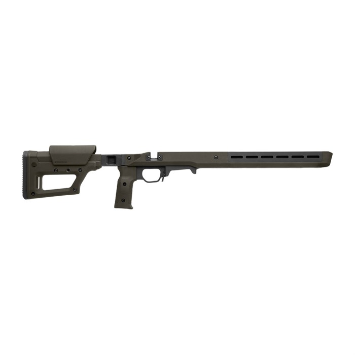 Maintaining the most important features of their original Pro 700, the Pro 700 Lite SA strikes a balance between features and cost without sacrificing performance. As the name suggests, the Pro 700 Lite SA blends the original Pro 700 Chassis and the PRS Lite stock to create a simplified rear end with a strong foundation – passing on the value and weight savings to you. The streamlined design weighs in at 4.4 pounds, a full pound less than its predecessor, but still packs a complete set of features that elevate your rifle’s performance. The Pro 700 Lite SA provides an optimized shooter interface with 0.8” of comb height and 1.4” of LOP adjustments. The low-profile rubber butt-pad is adjustable for height and cant, providing an extremely stable interface with the shooter’s shoulder. Sling attachment options include an ambidextrous 1.25” footman’s loop, a reversible QD sling swivel cup, and space for another optional QD sling swivel cup. The injection-molded polymer grip has a 5-degree forward edge sweep and enlarged palm swell with a 7-degree aft edge sweep for enhanced user comfort, and it includes a 0.75" fore/aft adjustment range using a common hex wrench. An additional grip is included, offering a more aggressive sweep and enlarged palm swell for the shooter who is more inclined to a less vertical grip interface (8-degree forward / 20-degree aft edge sweep). The Pro 700 Lite SA surrounds it’s billet aluminum chassis with Magpul polymer for enhanced ergonomics, strength, and sound mitigation. Built around the user, it is fully ambidextrous at the swap of a bolt retainer plate, and the vertical grip can be adjusted for various trigger reaches. The included large trigger guard can accommodate usage with gloves and aftermarket triggers. The AICS-pattern magazine well features an ambidextrous mag release and has a front barricade stop to prevent the rifle from resting on the magazine when using barricade support. Up front, there are numerous M-LOK slots (left-6/right-6/bottom-7) allowing you to mount whatever accessories your loadout calls for. Extremely versatile and adaptable, the Pro 700 Lite SA turns your short action 700-pattern rifle into the perfect bolt action precision machine. Made in the USA. Fully machined Type III hard anodized aluminum forend and V-bedding block Compatible with left and right-handed actions with swappable QD sling swivel and bolt retainer plates Comb height, LOP, and butt-pad adjustment from PRS Lite Integrated AICS pattern magazine well optimized for PMAG® 5 & PMAG® 10 7.62 AC magazines as well as most other AICS pattern short action magazines Low-profile, anti-snag ambidextrous magazine release is made of Melonite® treated steel A large trigger guard allows for use with gloves and accepts most factory and aftermarket curved or flat triggers Injection molded polymer grip with 5 degree forward edge sweep and enlarged palm swell with 7 degree aft edge sweep Additional grip option included with a more aggressive angle (8 degree forward / 20 degree aft edge sweep) Grips adjustable 0.75" fore and aft