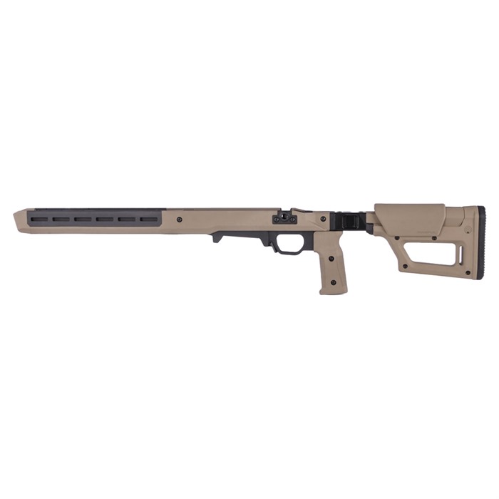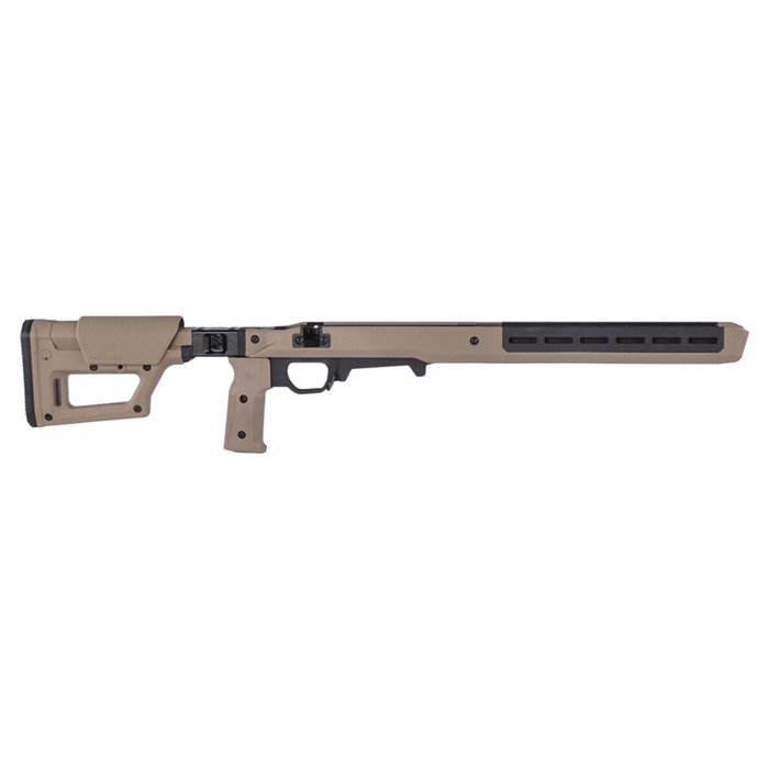 Maintaining the most important features of Magpul’s original Pro 700L, the Pro 700L Lite strikes a balance between features and cost without sacrificing performance. As the name suggests, the Pro 700L Lite blends the original Pro 700L Chassis and the PRS Lite stock to create a simplified rear end with a strong foundation – passing on the value and weight savings to you. The streamlined design weighs in at 4.5 pounds, a full pound less than its predecessor, but still packs a complete set of features that elevate your rifle’s performance. The Pro 700L Lite provides an optimized shooter interface with 0.8” of comb height and 1.4” of LOP adjustments (LOP measures 13.0” -14.4”). The low-profile rubber butt-pad is adjustable for height and cant, providing an extremely stable interface with the shooter’s shoulder. Sling attachment options include an ambidextrous 1.25” footman’s loop, a reversible QD sling swivel cup, and space for another optional QD sling swivel cup. The injection-molded polymer grip has a 5-degree forward edge sweep and enlarged palm swell with a 7-degree aft edge sweep for enhanced user comfort, and it includes a .75” fore/ aft adjustment range using a common hex wrench. An additional grip is included, offering a more aggressive sweep and enlarged palm swell for the shooter who is more inclined to a less vertical grip interface (8-degree forward / 20-degree aft edge sweep). The Pro 700L Lite surrounds its billet-aluminum chassis with Magpul polymer for enhanced ergonomics, strength, and sound mitigation. Built around the user, it is fully ambidextrous at the swap of a bolt retainer plate, and the vertical grip can be adjusted for various trigger reaches. The included large trigger guard can accommodate usage with gloves and aftermarket triggers. The AICS-pattern magazine well features an ambidextrous mag release and has a front barricade stop to prevent the rifle from resting on the magazine when using barricade support. Up front, there are numerous M-LOK slots (left-6 / right-6 / bottom-7) allowing you to mount whatever accessories your loadout calls for. Extremely versatile and adaptable, the Pro 700L Lite turns your long action, 700-pattern rifle into the perfect bolt action precision machine. FEATURES Fully machined aluminum fore end and bedding block AICS compatible bottom metal Vertical grip with adjustment for trigger reach Large trigger guard accommodates gloves and aftermarket triggers Compatible with left and right-handed actions Comb height, LOP, and butt pad adjustment from PRS Lite Injection-molded polymer grip with 5-degree forward edge sweep and enlarged palm swell with 7-degree aft edge sweep for enhanced user comfort combined with a .75” fore/aft adjustment range using a common hex wrench Additional grip option included with a more aggressive sweep and enlarged palm swell for the shooter that is more inclined to a less vertical grip interface (8 degree forward / 20-degree aft edge sweep) Multiple sling attachment points (an ambidextrous 1.25” footman’s loop, a reversible QD sling swivel cup, and a space for another optional QD sling swivel cup Made in the USA COMPATIBILITY Compatible with Remington® 700 Long Action and other Remington 700 Long Action footprints. Buttstock/cheek riser must be removed on the Pro 700L Lite before the user can remove the bolt from the action. Ships with MAG698 (Magnum Long Action AICS 5-round PMAG)