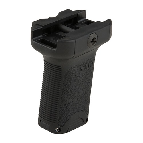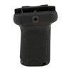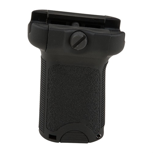 Polymer vertical grip attaches to Picatinny rail to help improve weapon handling and control. Cross-bolt design allows installation with field expedient tools, like coin or cartridge rim, and mounting clamps are reversible. Short grip won't snap on slings and gear, and forward angle gives more natural wrist position. Texture and ridges give superior grip, and storage compartment holds spare batteries or other accessories. Available in black or Flat Dark Earth.