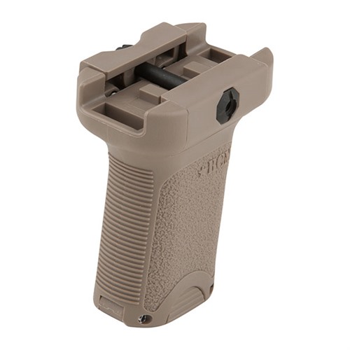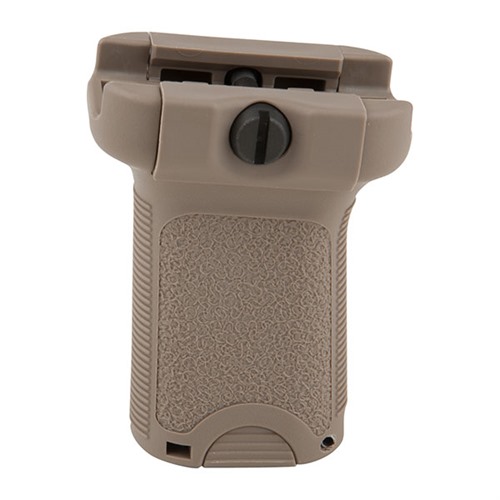 Polymer vertical grip attaches to Picatinny rail to help improve weapon handling and control. Cross-bolt design allows installation with field expedient tools, like coin or cartridge rim, and mounting clamps are reversible. Short grip won't snap on slings and gear, and forward angle gives more natural wrist position. Texture and ridges give superior grip, and storage compartment holds spare batteries or other accessories. Available in black or Flat Dark Earth.