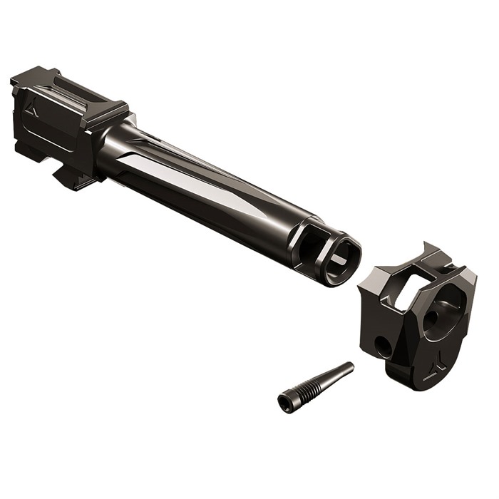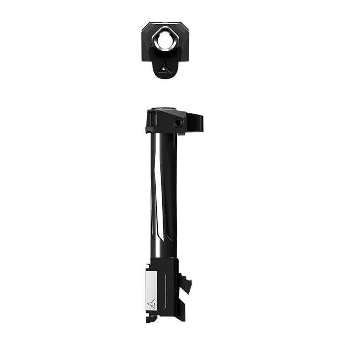 The Radian® AFTERBURNER™ + RAMJET™ combo provides unprecedented recoil reduction and match grade accuracy in a concealed carry package. The threadless barrel design allows for repeatable, effortless installation and removal for cleaning. The AFTERBURNER™ compensator is machined from hardened 17- 4 SS and the RAMJET™ barrel from hardened 416R SS; both are enhanced with a DLC (Diamond-Like Carbon) coating. This combination achieves low friction, high hardness, and high corrosion resistance, making overall durability and erosion from muzzle blast a non-issue. The INTRA-LOK® mounting system uses the taper lock principle; a tapered locking screw interfaces with an angled V-groove on the underside of the barrel. This perfectly times the compensator as it locks down onto the upper barrel profile on the muzzle end of the barrel. INTRA-LOK® allows the user to simply slide the compensator over the barrel, insert and tighten the locking screw, making for a simple and repeatable installation process. This system allows the user to easily remove the barrel from the slide for cleaning. Installed onto a Glock™ G19™, the AFTERBURNER™ + RAMJET™ combo increases the overall length of the slide to a G17® allowing compatibility with all G17 holsters. Angled front faces on the AFTERBURNER aid in holstering.