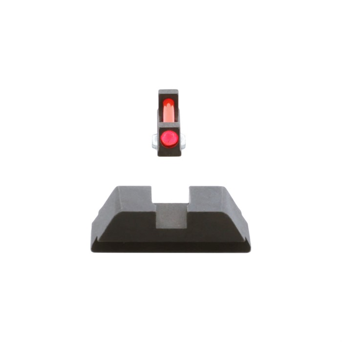 Range Series iron sights from AMERIGLO® are designed for every day concealed carry pistols, offering rugged, simple, effective designs that work. They are designed for speed and accuracy with a .115"" front sight blade paired with a perfect-width rear notch. SPECS Fits Make: Glock® Fits Model: Gen 1-4 9mm/.40/.380, Gen 5 10mm/.45 Fits MOS Slide: Yes Front Sight Style: Red Fiber Optic Front Sight Finish: Case Hardened Front Blade Width: 0.115 in. (2.92mm) Front Blade Height: 0.165 in. (4.19mm) Rear Sight Style: Flat Black Rear Notch Shape: Square Rear Sight Finish: Case Hardened Rear Blade Height: 0.176 in. (4.47mm) Overall Rear Height: 0.256 in. (6.5mm)