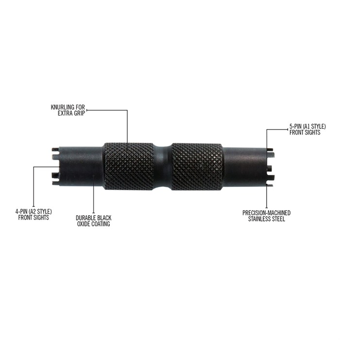 813119011467 Tämä kompakti, ruostumattomasta teräksestä valmistettu työkalu tekee nopeista tähtäinasetuksista helppoa. Kestävyytensä ja kekseliäisyytensä ansiosta kaksipäinen AR15 Front Sight Adjuster Tool on suunniteltu toimimaan sekä A1- että A2-tähtäimien kanssa, vähentäen tarpeen täyttää ampumarinkisi. Ominaisuudet: - Säädettävä 4-pinninen (A2-tyyli) etutähtäin - Säädettävä 5-pinninen (A1-tyyli) etutähtäin - Tarkkuusjyrsitty ruostumaton teräs - Kestävä musta oksidipinnoite.Toimitusaika noin 2-4 viikkoa.