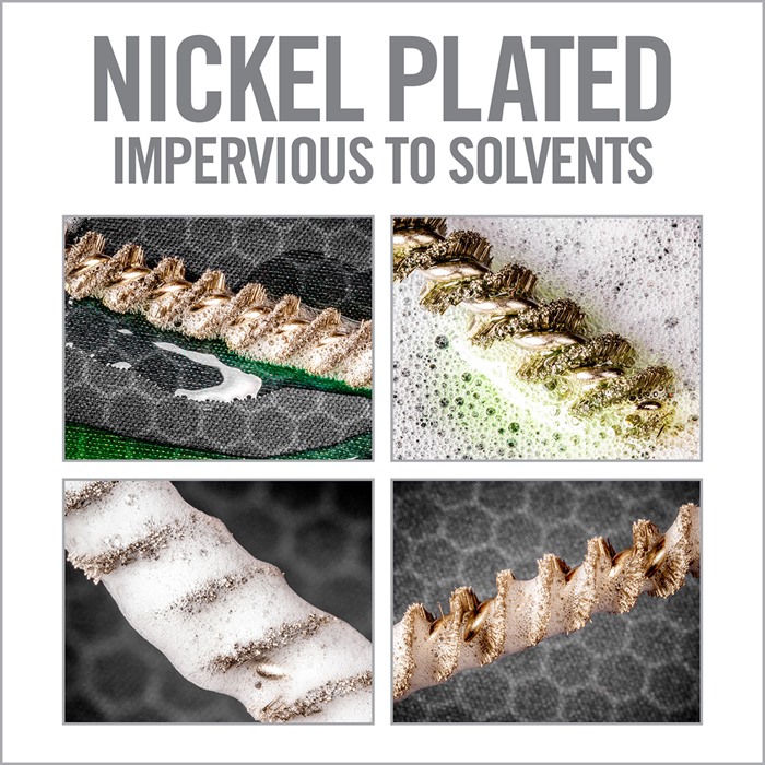 Jäykät, nikkeli-pinnoitetut fosforipronssiharjakset vähentävät kemiallista hajoamista liuottimista ja pidentävät harjan käyttöikää.