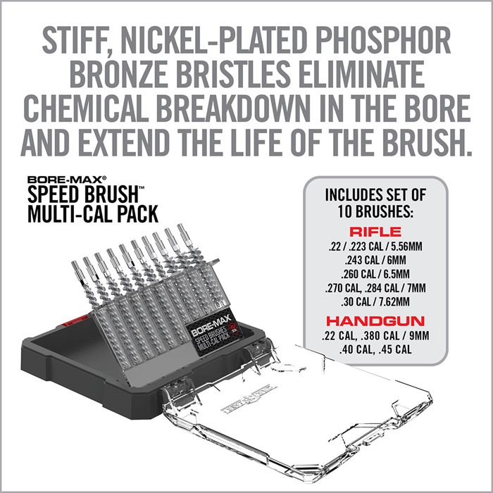 Tämä Bore-Max Speed Brush -pakkaus sisältää 10 suosittua pistooli- ja kiväärikaliiberia yhdessä kätevässä säilytyskotelossa. Bore-Max Speed Brushes -harjat tarjoavat kaksinkertaisen harjasten tiheyden verrattuna tavallisiin harjoihin, mikä takaa maksimaalisen puhdistusvoiman ja nopeammat tulokset.