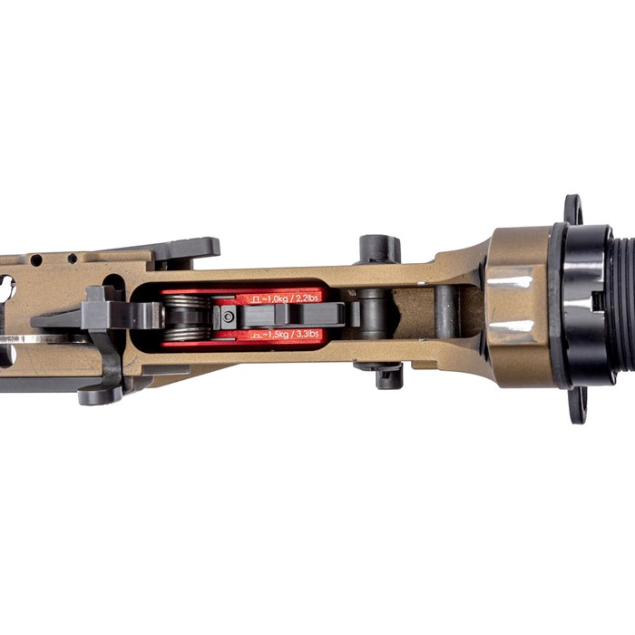 ERATAC-Trigger AR 15/10: Tämä "Real Drop In" -liipaisin voidaan asentaa ilman aseen ja liipaisimen purkamista. Aseen kuljetusta varten voit poistaa liipaisimen vain muutamalla askeleella ja näin saat maailman turvallisimman aseen. Kiinnityspultit on suojattu putoamiselta ja häviämiseltä integroidun pulttilukon avulla. Liipaisimen paino voidaan säätää >2.2 paunasta (1000g) >3.3 paunaan (1500g) ennalta määriteltyjen kolojen avulla. Säätöä ei vaadita. Asetetun liipaisimen painon voi lukea kotelosta. Jokainen liipaisin testataan ja kirjataan sarjanumeron perusteella. Minimiliipaisimen painojen noudattaminen vahvistetaan leimalla ja allekirjoituksella. Jokaisen liipaisimen mukana tulee henkilökohtainen todistus. Tässä ovat erityisominaisuudet tiivistettynä: Todellinen drop-in liipaisin, ei vaadita aseen tai liipaisimen purkamista. Valmistettu kevyestä lentokonesertifioidusta alumiinista ja kovetetusta teräksestä. Terävä ja ilman liukuma-aluetta oleva yksivaiheinen liipaisin. Erittäin lyhyt veto ja palautus mahdollistaa nopean jatkosijoittamisen. Helppo vaihtaa >2.2 paunan (1000g) ja >3.3 paunan (1500g) liipaisimen paino kahdessa määritellyssä asennossa. Valinnaisesti kaarevalla tai suoralla terällä. Liipaisimen painon säätö ja liipaisimen asennus yhdellä työkalulla (mukana toimituksessa). Vakuuttaminen ei ole mahdollista, kun ase on kaatunut (tämä tarkoittaa, että aseen lataustila on tunnistettavissa). Lataaminen ei ole mahdollista, kun ase on lukittu. Asennus mahdollinen kaikissa yleisissä AR-järjestelmissä (.22lfb, 9mm, 7.62mm, 5.56mm, H&K, Haenel, OA, Hera, Tippman, Stag jne.). Mitat: 2.36"x0.67"x2.76" (60mm x 17mm x 70mm). Paino: 0.1653 paunaa (75g).Uudelleen tilattu, toimitusaika n. 4-12 viikkoa Euroopan varastosta.