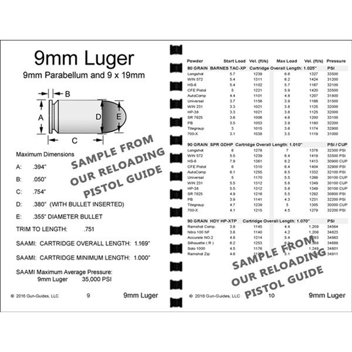 RELOADING GUIDE FOR PISTOLS tarjoaa käsilatauskaavoja myös +P-latauksille sekä 9mm:lle että .45 ACP:lle. Oppaassa on useita tukisivuja, jotka keskittyvät olennaisiin latauselementteihin, kuten: