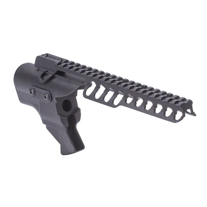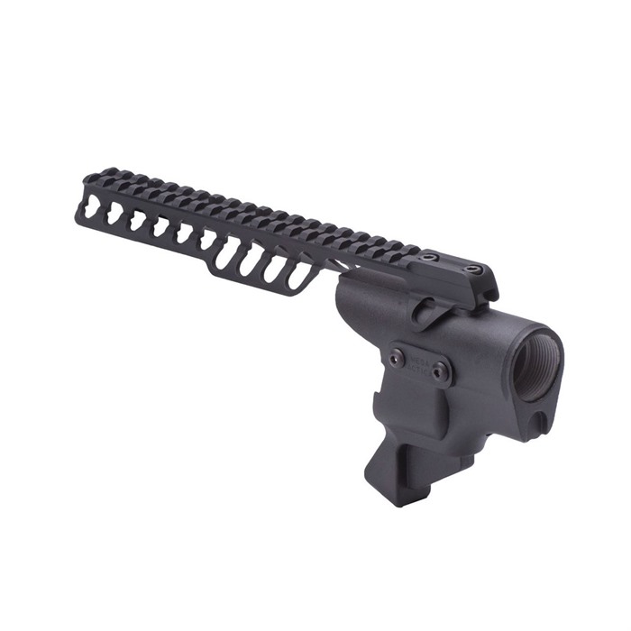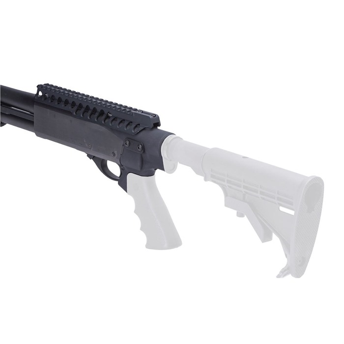 Mesa Tactical has made the ability to install AR-15 adjustable buttstocks and pistol grips to your Remington 870 12 gauge a real possibility to allow for the ultimate in a tactical shotgun configuration! The Mesa Tactical Remington 870 12 Gauge High-tube® telescoping stock adapter facilitates the use of a collapsing or telescoping stock for your shotgun, in doing so this shortens the length of pull which is especially important for law enforcement or tactical operators. The High-tube adapters require an optics rail due to the comb height, which Mesa Tactical has included with the system. The Mesa Tactical Remington 870 12 Gauge High-tube® Telescoping Stock Adapter and Rail Kit is a simple concept in that the shotgun stock is replaced by an adapter that mimics the stock attachment point of an AR-15 lower receiver. The adapter accepts an AR-15 receiver buffer tube, the collapsible stock and pistol grip can then be securely attached to the shotgun. Shotgun Stock is replaced with adapter that mimics the stock attachment point of an AR-15 Fits Remington 870 12 gauge Generally will NOT fit semi-auto shotguns due to the return spring housing Can accept almost any stock or grip combination made for the AR-15 platform. The only grip limitation issue is in regards to the duck bill style grip 9” rail with black finish No special tools required for installation Factory suggests blue Loctite® liquid thread locker for screw heads
