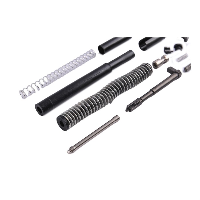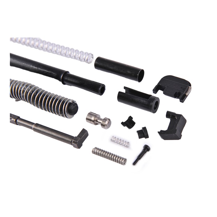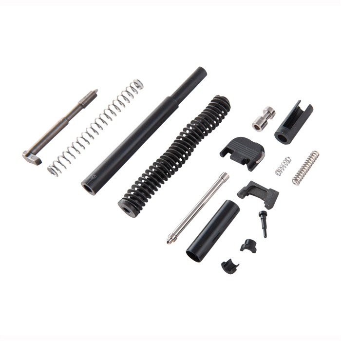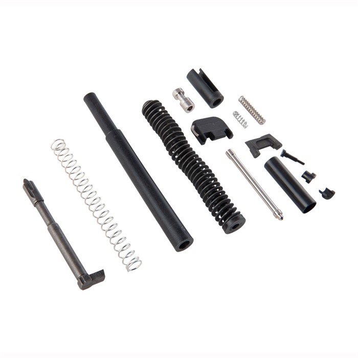Contains all the parts you need to complete the innards of an aftermarket slide or refurbish a factory slide to like-new standards. All the parts in our Glock 17® Gen3 Slide Parts Kit are aftermarket parts made to the correct dimensions for proper fit, finish, and function in a factory spec slide. The extractor and firing pin are made from cast 17-4 SS. The extractor depressor plunger and firing pin safety are machined from bar stock. Includes channel liner tool to properly install the channel liner. Kit Includes: Extractor Extractor Depressor Plunger Extractor Depressor Plunger Spring Spring -Loaded Bearing Slide Cover Plate Firing Pin Spacer Sleeve Firing Pin Spring Spring Cups Firing Pin Safety Firing Pin Safety Spring Channel Liner Channel Liner Tool Guide Rod and Recoil Spring Assembly