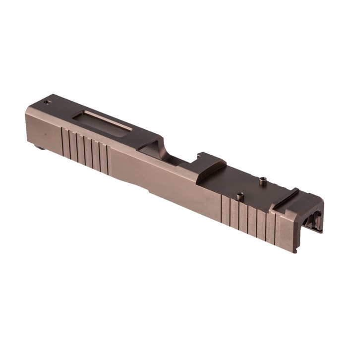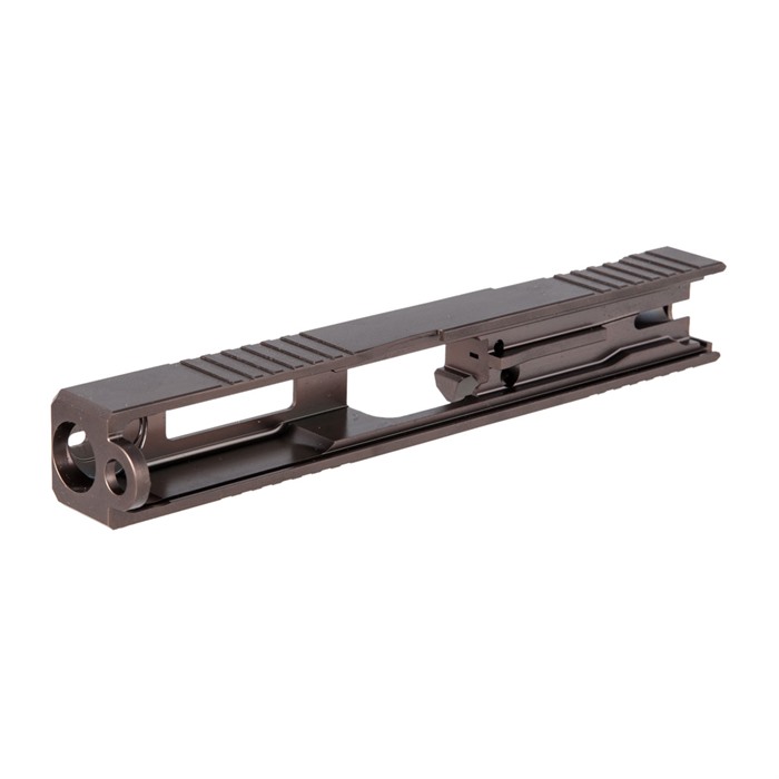 Our RMR Slide for Glock® 17 Gen3 pistols features distinctive, wraparound front cocking serrations that aid in manipulating the slide to check the chamber or clear a jam. (OK, we’ll admit it: the serrations just look cool, too.) It also comes with a pre-cut slot for easy, secure mounting of a Trijicon RMR or Holosun red dot sight. All RMR Slides also have standard Glock® factory front and rear sight dovetails for "iron" backup sights. To get proper co-witnessing with the RMR, you will need to also install suppressor-height iron sights. You can also get your Brownells RMR Slide for Glock® 17 Gen3 with a "window" cutout on top that enhances airflow to keep the barrel cool - ideal for hard-working action competition pistols. Plus, if you have an upgraded barrel with a contrasting finish or a unique exterior pattern (fluting, spirals, "flames," etc.) the window lets you show it off a bit! Each RMR Slide for Glock® starts life as a billet of 17-4 stainless steel that is machined to Glock® factory specifications inside, so it’ll fit factory frames and accept factory or aftermarket barrels and Gen3 internal parts. Slides are heat-treated to Rc 41-44 on the Rockwell C scale for added surface hardness and wear resistance. You can get your RMR slide in one of 3 finishes: a wear-resistant basic Black Nitride, or a thin, extremely tough, physical vapor deposition (PVD) coating in Bronze or Flat Dark Earth (FDE). Fits Gen3 Glock® 17 pistols & clones Machined from corrosion-resistant 17-4 stainless steel billet Trijicon RMR mounting slot Also accepts Holosun HE508T, HS507C & HS407C red dot sights Plus factory front/rear sight cuts Available with distinctive top Window cutout or traditional Solid top A Brownells RMR Slide is the ideal upgrade for your factory Glock® 17 Gen3 pistol OR the perfect "top half" for a brand-new custom gun built on a Polymer80 80% frame. Brownells Gun Tech™ Note: Channel liner required for these slides. Channel liner is a press fit and requires a tool to install. We recommend #777-100-017. Includes patented optic cut technology pioneered by ZEV Technologies. Patent No. RE47335