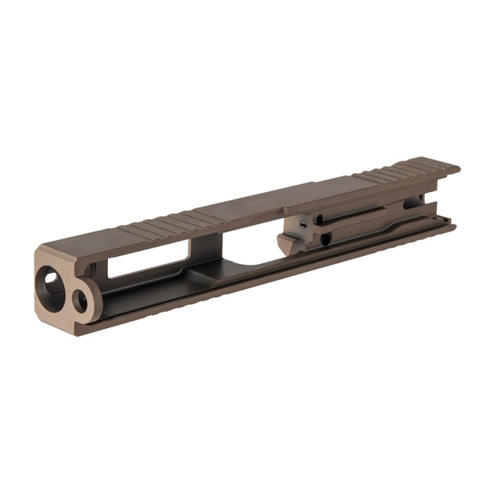 Our RMR Slide for Glock® 17 Gen3 pistols features distinctive, wraparound front cocking serrations that aid in manipulating the slide to check the chamber or clear a jam. (OK, we’ll admit it: the serrations just look cool, too.) It also comes with a pre-cut slot for easy, secure mounting of a Trijicon RMR or Holosun red dot sight. All RMR Slides also have standard Glock® factory front and rear sight dovetails for "iron" backup sights. To get proper co-witnessing with the RMR, you will need to also install suppressor-height iron sights. You can also get your Brownells RMR Slide for Glock® 17 Gen3 with a "window" cutout on top that enhances airflow to keep the barrel cool - ideal for hard-working action competition pistols. Plus, if you have an upgraded barrel with a contrasting finish or a unique exterior pattern (fluting, spirals, "flames," etc.) the window lets you show it off a bit! Each RMR Slide for Glock® starts life as a billet of 17-4 stainless steel that is machined to Glock® factory specifications inside, so it’ll fit factory frames and accept factory or aftermarket barrels and Gen3 internal parts. Slides are heat-treated to Rc 41-44 on the Rockwell C scale for added surface hardness and wear resistance. You can get your RMR slide in one of 3 finishes: a wear-resistant basic Black Nitride, or a thin, extremely tough, physical vapor deposition (PVD) coating in Bronze or Flat Dark Earth (FDE). Fits Gen3 Glock® 17 pistols & clones Machined from corrosion-resistant 17-4 stainless steel billet Trijicon RMR mounting slot Also accepts Holosun HE508T, HS507C & HS407C red dot sights Plus factory front/rear sight cuts Available with distinctive top Window cutout or traditional Solid top A Brownells RMR Slide is the ideal upgrade for your factory Glock® 17 Gen3 pistol OR the perfect "top half" for a brand-new custom gun built on a Polymer80 80% frame. Brownells Gun Tech™ Note: Channel liner required for these slides. Channel liner is a press fit and requires a tool to install. We recommend #777-100-017. Includes patented optic cut technology pioneered by ZEV Technologies. Patent No. RE47335