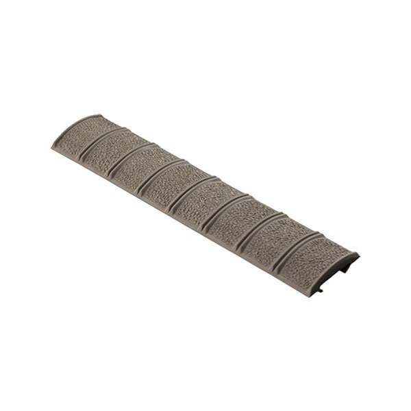Tough, polymer cover slides over Picatinny rails to protect shooter’s hand from sharp edges of unused rails, and shield exposed rails from damage during rough tactical operations. Makes rail less likely to snag clothing and equipment and gives the rounded contour of a smooth, circular handguard with the freedom to reconfigure accessories whenever you need to. Rubber-like, pebble-texture grip surface helps shooter maintain better weapon control. Each panel covers 15 rail slots—the correct length to fit many carbine-length handguards without modification. Pre-segmented construction for ease in cutting to length to custom fit on other handguards. Multiple sections can be mounted one after the other for smooth, visually continuous cover on longer handguards.