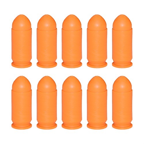 SAF-T-TRAINERS DUMMY ROUNDS, 45 AUTO ORANGE DUMMY ROUNDS 10/PACK on täydellinen valinta koulutusharjoituksiin. Näiden kirkkaan väristen muovipatruunoiden erilainen "tunne" varmistaa, ettei niitä sekoiteta oikeisiin patruunoihin.