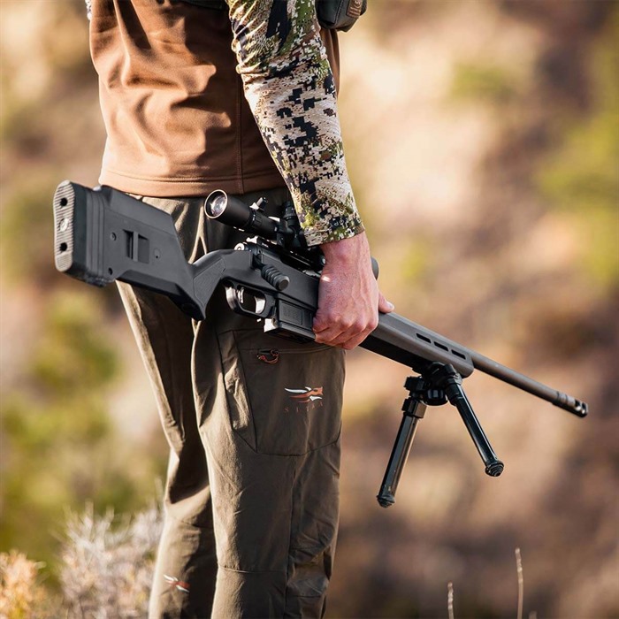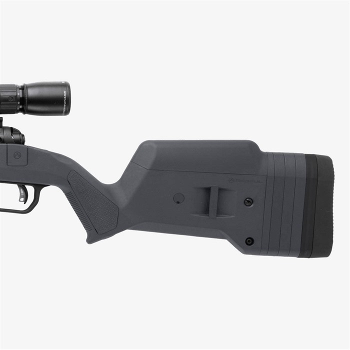 The Hunter 110 Stock – Savage 110 Short Action is the latest addition to the Magpul Hunter stock product line. It features enhanced ergonomics, versions for both right and left-hand actions, eight M-LOK® slots for mounting options, and a fully adjustable length of pull and comb height. These features have been optimally designed to provide a more stable shooting platform, improved user comfort and individual accessory customization. Like its predecessors, the Magpul Hunter 110 features a Type III hard anodized, machine-finished, cast aluminum bedding block that doesn’t require bedding and is a true “drop-in” stock solution. The Hunter 110 is designed for 3rd generation Savage short action Series 10/110 centerfire rifles that have center-feed magazine compatibility and action screw hole spacing of 4.40” (H-prefix and later) with production a date of 2006 and later. The Hunter 110 also includes Magpul’s Bolt Action Magazine Well for optimal functionality with AICS-spec detachable box magazines such as Magpul’s PMAG® 5 7.62 AC (sold separately). FEATURES Reinforced polymer shell with Type III hard anodized, machine finished, A380 cast aluminum V-bedding block. Available for right and left hand actions. Provides AICS-spec magazine compatibility for optimal performance and reliability (magazines sold separately) Made in the USA. SPECS Collection: Hunting Stocks Platform: Savage® 110 Butt-Pad Dimensions: 1.5 in W x 5.0 in H LOP Adjustment Range: 13.0 in, - 15.0 in. (13 in. with no spacers plus up to four half-inch spacers) Weight: 3.3 lbs. Width of Butt, max: 1.5 in. Width of Forend, max: 2.3 in. Compatible with 3rd generation Savage short action Series 10/110 centerfire rifles with center-feed magazine compatibility and action screw hole spacing of 4.40” that began in 2006. Compatible with barrel profiles up to Medium Palma and Savage Varmint barrel contours. Tapered Beam design provides rigidity through the forend and will free-float compatible barrels. Push-button QD swivel compatibility with optional Sling Mount Kits in rear of stock.