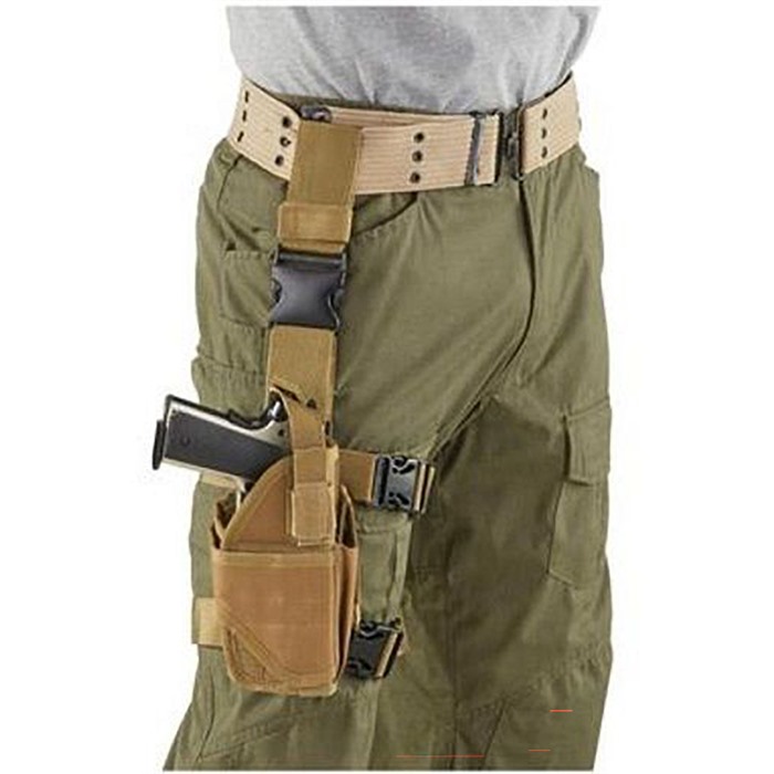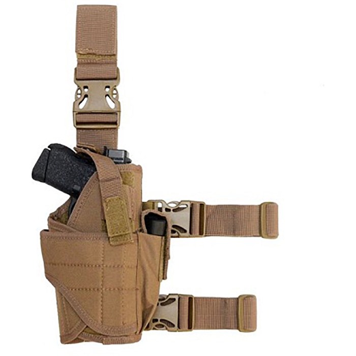 CACTUS JACK TACTICAL DROP LEG HOLSTER The Drop Leg Holster is an adjustable hip rig to secure most handguns. Compatible with these popular firearms: Glock 17, Beretta 92, 1911 models, and more. A hook and loop side pouch will hold a 7-15 round pistol mag. 600 Denier polyester construction gives the holster a sturdy body that adjusts to fit your pistol. Hook and loop flaps teamed with an adjustable webbing strap secure the pistol. Reinforced webbing adjusts to fit a riggers, pistol, or duty belt with a quick-release buckle for rapid removal. The leg harnesses are elastic and webbing, and the straps are also coupled with quick-release buckles. Mount this holster to your hip for quick access to your pistol. Trust that your defense is just inches away. FEATURES: Fully adjustable pistol holster Velcro + elastic adjustable thigh straps Quick-release belt attachment For right hand use only Durable 600 Denier construction Weight: 15.0 oz.