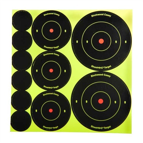No need for spotting scopes or binoculars. When the bullet hits, the black is replaced by a bright halo of fluorescent, chartreuse color that makes the hit instantly visible to the naked eye. Convenient, peel-n-stick, self-adhesive backing. 8" Crosshair – Round target with fluorescent orange “crosshair” pattern, shows bullet holes as splashes of bright fluorescent orange on impact. Available in paks of 6 or 50 targets. Includes repair pasters. 8" Laser Reflective – Round bullseye target with stick-on reflective target centers that provide maximum contrast of aiming dot from laser sight or laser boresighter. Turns fluorescent chartreuse on bullet impact. 1", 2", 3" Bullseye - 12 sheets with 72-1", 36-2", 24-3" targets. 9" Oval - 5 targets, 15 replacement centers.
