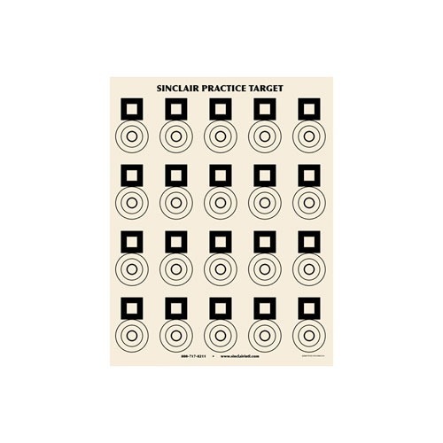 This 100 yard practice target will save a lot of trips from the bench to the target frame. Our 10 x 13 target has 20 official size 100 yard group benchrest targets without the outer two rings. Competitive benchrest shooters use this kind of targets on practice days before big matches since they can only go down range when the firing line is shut down and safe. The target is printed on good target stock, so holes form as they do in competition. The black aiming square is included for practice in heavy mirage. Good for 17 to 30 caliber rifles for practice and load testing.