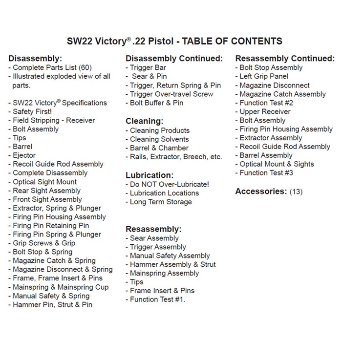 Kun Smith & Wesson SW22 Victory -pistooli lanseerattiin, sen tavoitteena oli tarjota helppohoitoinen pistoolialusta omistajille. Kuitenkin, aseessa on monia yksityiskohtia, joita on helppo ohittaa. SMITH & WESSON SW22 VICTORY 22LR Kokoamis- ja purkuopas tarjoaa kaiken tarvittavan tiedon ymmärtääksesi jokaisen osan tästä käsipyssystä.