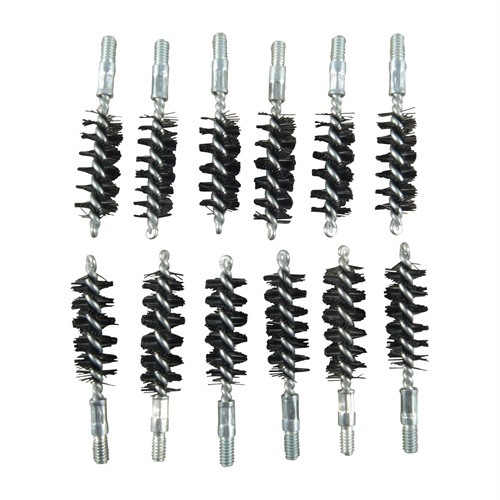 Since darn near as many bore brushes get used in the shop as get sold, we’ve packed these custom-made, top quality brushes in bulk paks to make them more convenient and less expensive. The shank is one-piece, looped and wound (not two, twisted together and chopped off). Nylon Bore Brush - New generation bore cleaners attack copper and bronze-based bullet jacket fouling aggressively and are just as hard on bronze cleaning brushes. Our nylon brushes stand up to these super cleaners and won’t cause accuracy-ruining scratches. One-piece, looped and wound steel shanks (except Black Powder (BP) series, .17 caliber, and .20 caliber, which have brass shanks). SPECS: Bristles: Available in nylon. Shank: Steel, looped and wound. Overall Length: 2-1/8 (5.4cm) Thread: 17 caliber 5-40 thread, all others 8-32 thread